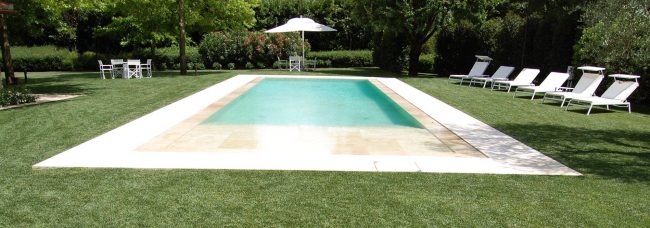 Struttura in C.A. Rivestimento travertino Bordo tracimante in travertino Situata in una posizione eccezionale con vista sul mare dell’Argentario, la scelta architettonica ha privilegiato un colore uniforme, perfettamente integrato con l’abitazione, per solarium e rivestimento; le fioriere con piante acquatiche delimitano la zona piscina e allo stesso tempo danno continuità a tutto il contesto.