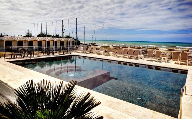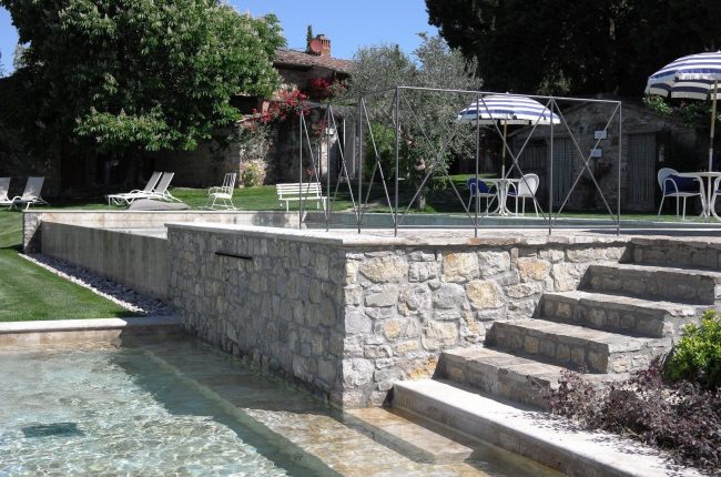 Rivestimento interno in travertino Bordo Tracimante Copertura automatica Piscina riscaldata Vasca bimbi Realizzazione in general contractor: demolizione completa della piscina esistente e costruzione della nuova piscina 6,25 x 16,00 ml, completa di vasca relax, copertura automatica, impianti e pompa di calore per riscaldamento. A servizio dell’hotel “Villa Le Barone” a Panzano in Chianti.