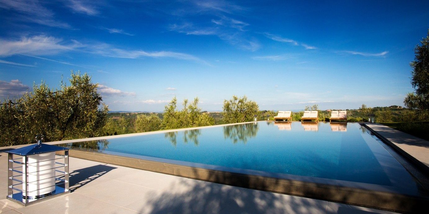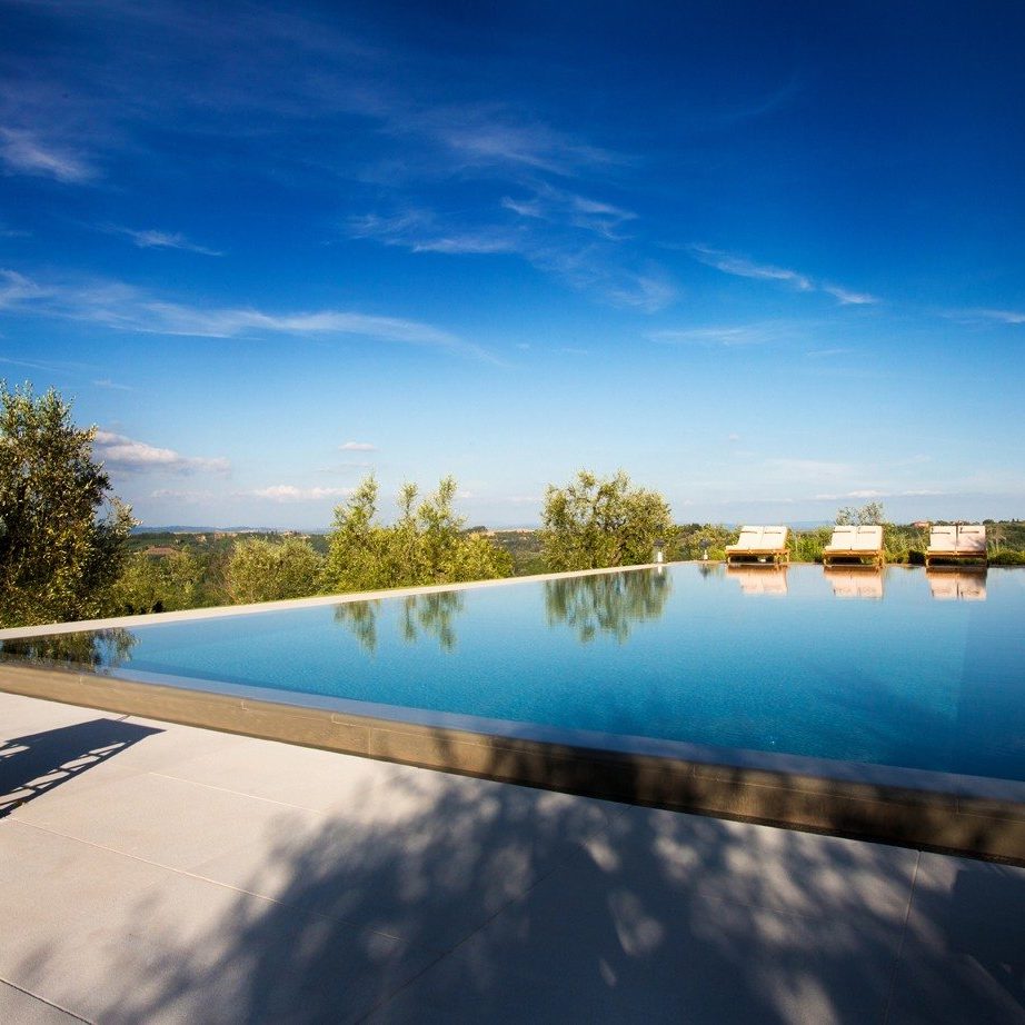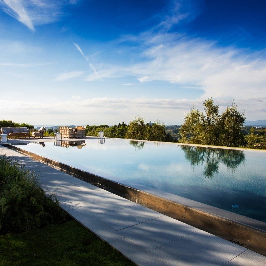In questa realizzazione abbiamo utilizzato una soluzione particolare con un bordo sfioro su 4 lati a cielo aperto, abbinato ad un ingresso a spiaggia e scalinata estesa a tutta la larghezza della piscina.