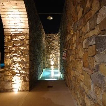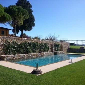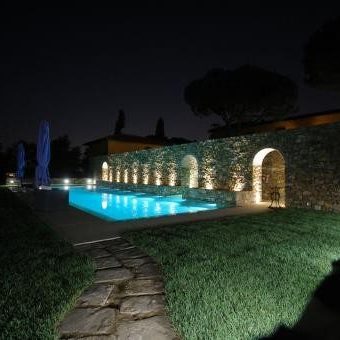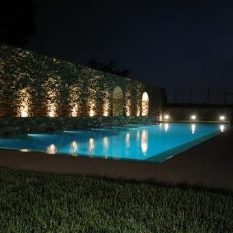 A servizio di una dimora storica, questa piscina davvero particolare è stata adagiata a ridosso del muro di cinta, ricavando l’ingresso in vasca sotto al porticato esistente. L’effetto ottenuto è quello interno/ esterno fra gli archi, valorizzato dalla particolare illuminazione che conferisce al tutto un effetto quasi magico.