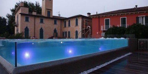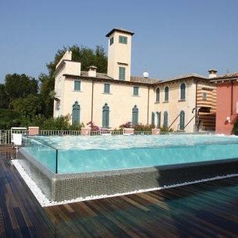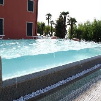 Piscina di forte impatto estetico grazie alle pareti in cristallo e alla posizione su una grande terrazza con vista panoramica sul Lago di Garda. Dotata di settore idromassaggio total boby con bocchette e piastre ad effervescenza.