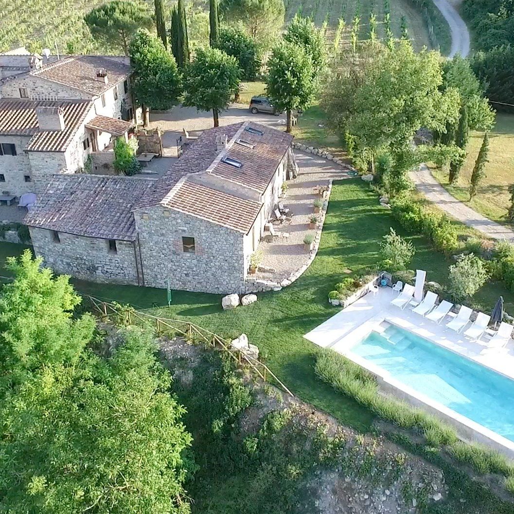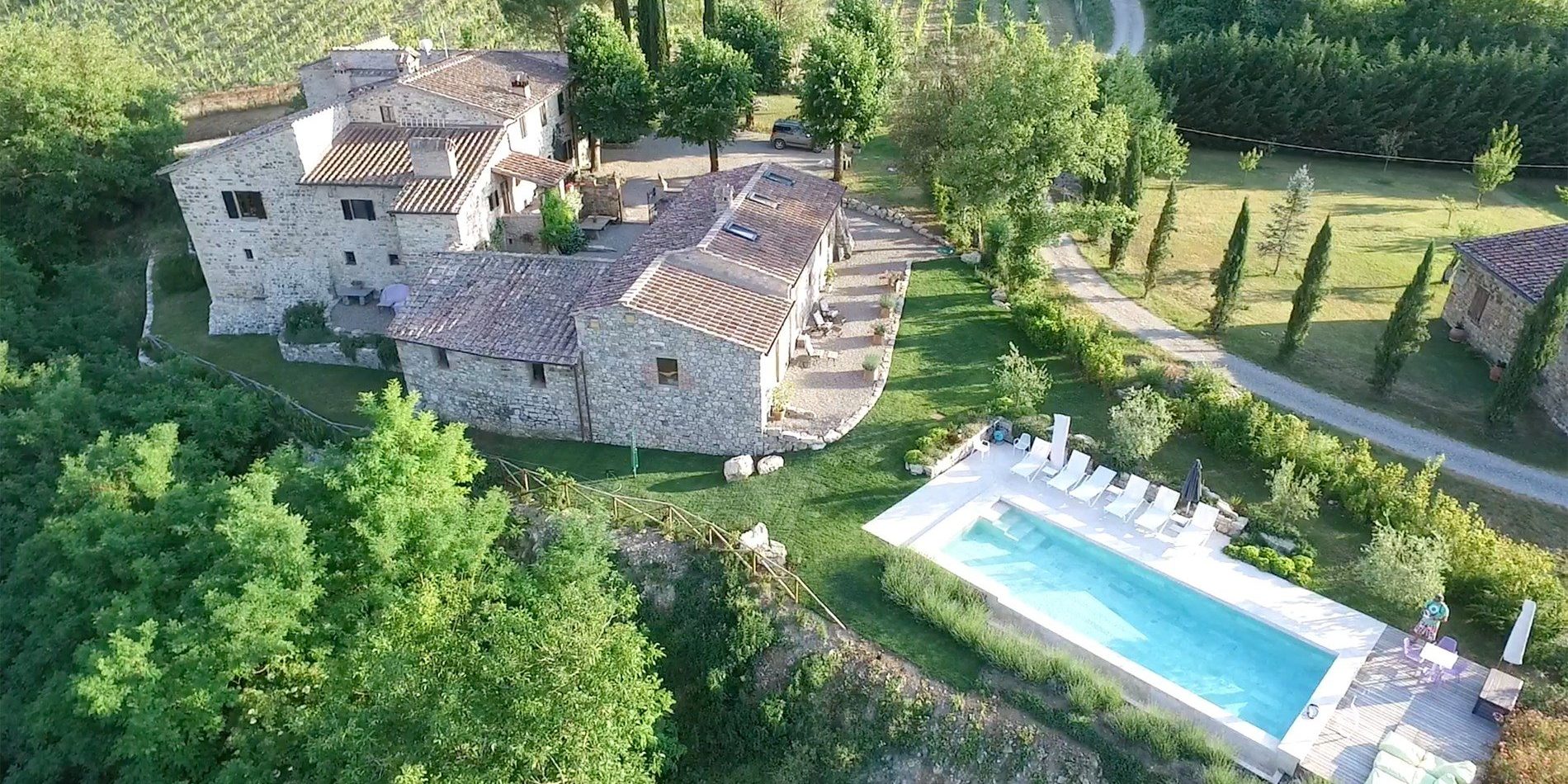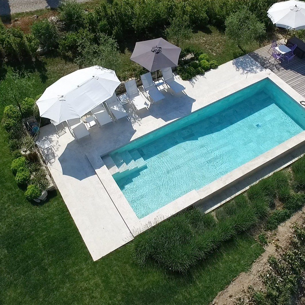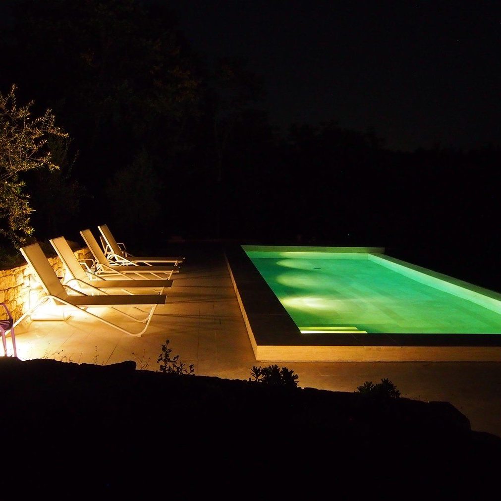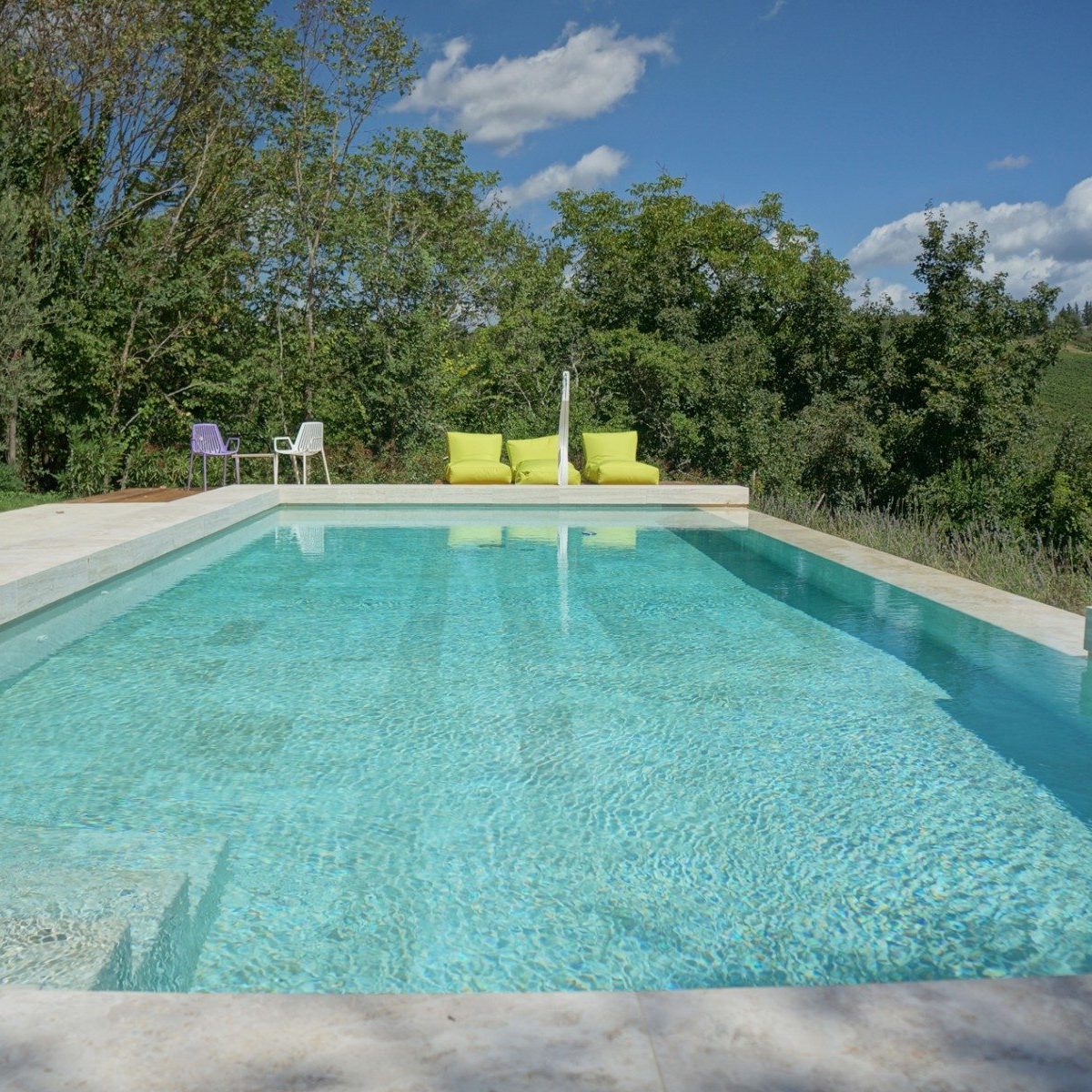 Piscina a servizio di una bellissima colonica chiantigiana finemente ristrutturata, realizzata ricercando un effetto di contrasto con lo stile dei fabbricati grazie soprattutto alle linee pulite della vasca e dall’utilizzo del travertino chiaro per i rivestimenti ed il solarium; il bordo tracimante su parte del lato lungo esalta la vista del paesaggio.