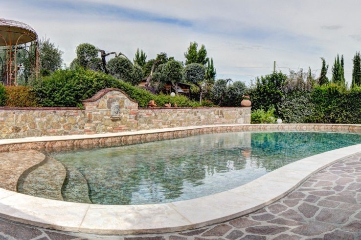 Struttura C.A. Forma libera Dimensioni 6,15 x 12,85 Rivestimento interno in PVC touch authentic Bordo in travertino Accessori interni in acciaio inox Realizzata in aperta…