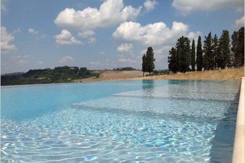 Struttura vasca Semi-prefabbricata in pannelli acciaio Dimensioni ml. 4,00 x 12,50 Bordo e bordo tracimante pietra tipo iron brown Rivestimento interno in pvc alkorplan 2000 di…